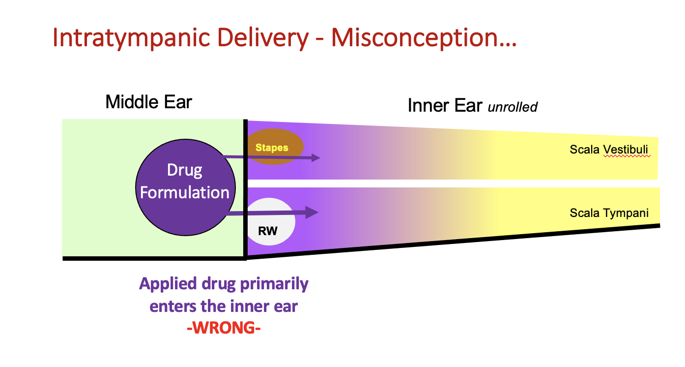 There is a common misconception that drug solutions applied intratympanically (into the middle ear cavity) “stay around for a while”, giving time for the applied drug to spread into the inner ear. Some even think that delivery in this manner is relatively efficient, allowing most of the applied drug to enter inner ear perilymph over time.
