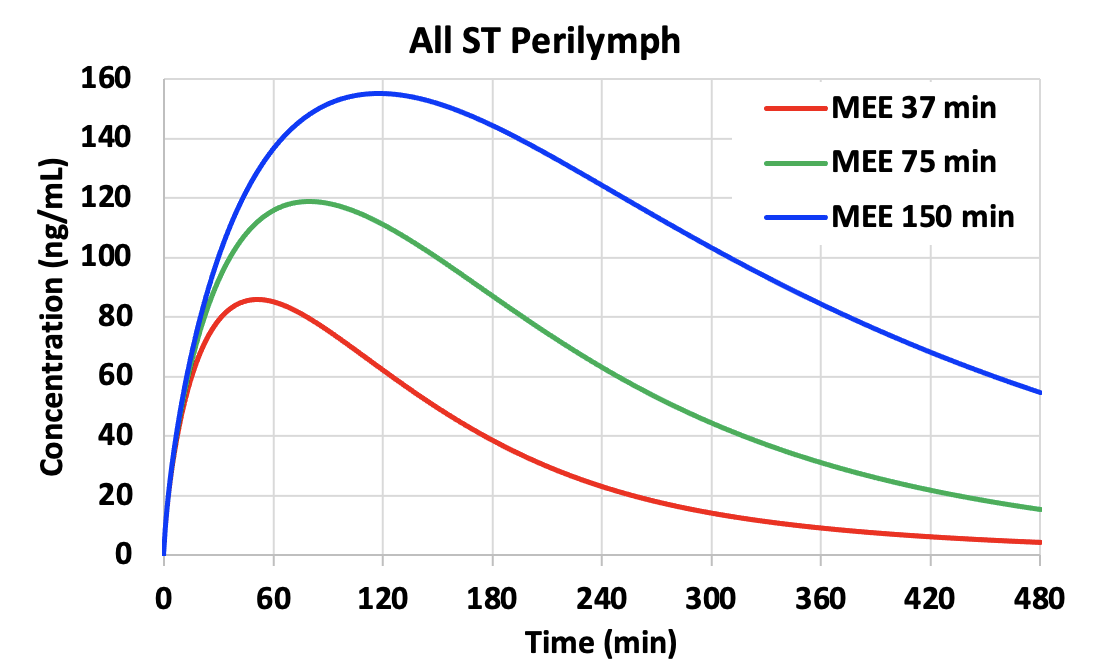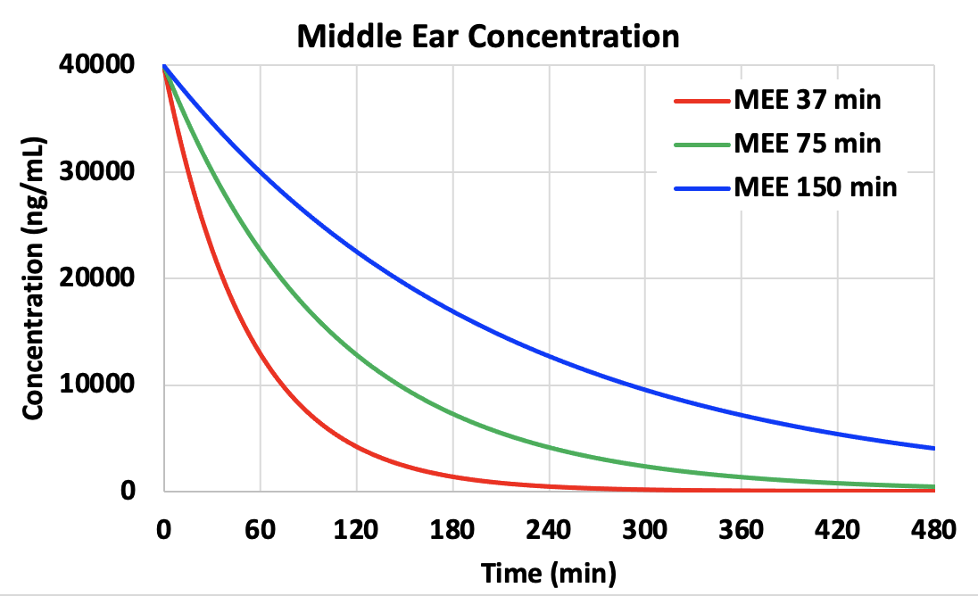 The rate of elimination from the middle ear has a major influence on perilymph drug levels reached. Shown below is a calculation for gentamicin entry into perilymph by FluidSim using parameters appropriate for gentamicin. The normal middle ear elimination (MEE) half time is about 75 min (from the studies above). In the calculations we have changed elimination half-times by a factor of 2, higher and lower, altering the rate of decline as a function of time. Persistence time in the middle ear has an enormous influence on perilymph concentration, with a higher, later peak when elimination occurs more slowly (blue curves). All other calculation parameters were unchanged across the 3 conditions. Differences in perilymph concentration, time course and distribution along the cochlea (not shown) are a direct result of the different middle ear kinetics.
