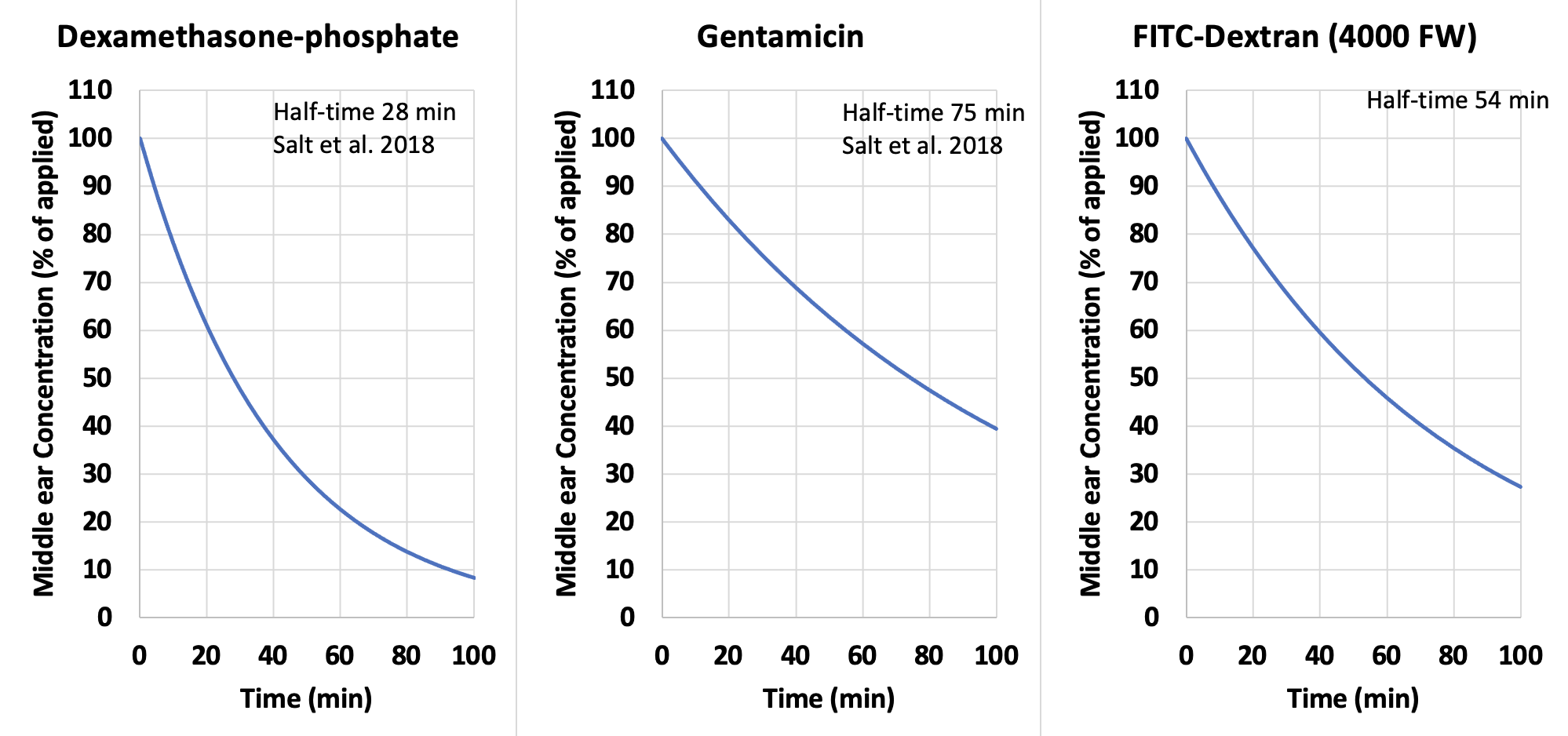 Especially when comparing across species, similar kinetics of the middle ear cannot be assumed. In one study where the kinetics of two drugs were compared in guinea pigs and humans, it was found that CHIR99021 was lost from the middle ear guinea pigs with a 56.4 min halftime while VPA was lost with a 48.6 min halftime (McLean et al.,.2021). These rates are close to those found for other drugs, as shown in the plots above. Comparable measurements with samples from the human middle ear found that the losses were even faster, with halftimes of 10.6 min (CHIR99021) and 8.9 min (VPA) respectively fitting the measurements. This is probably a consequence of the highly aerated mastoid in the human, with higher surface area to volume ratio than found in the simple, open bulla of the guinea pig. Nevertheless, in cases where kinetics of the middle ear are substantially different, the difference will certainly have a major influence on perilymph levels achieved.