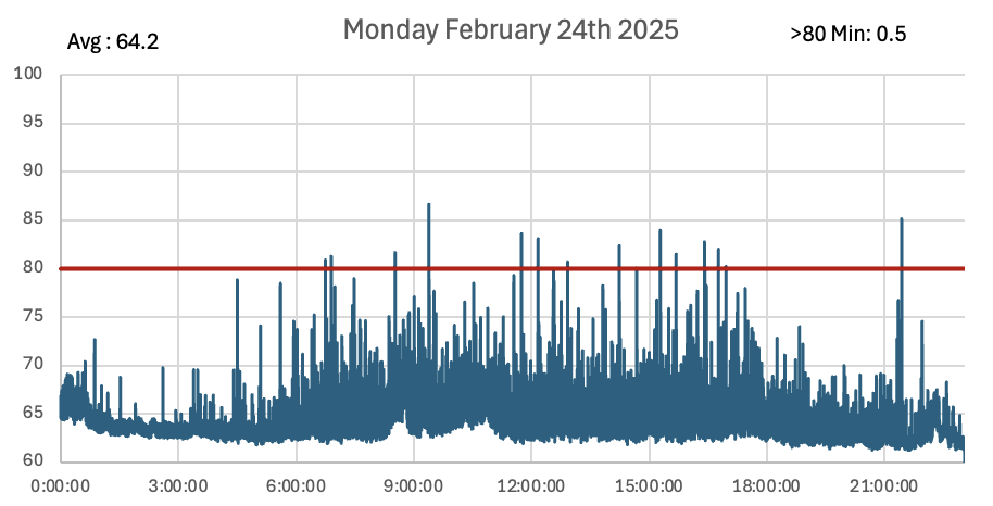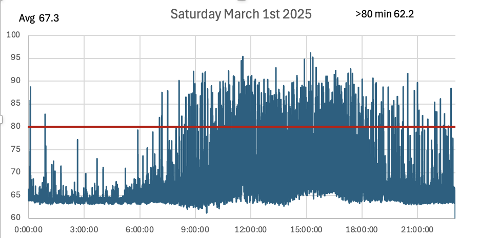 The trace below shows the noise levels measured on March 1st 2025, the first Saturday of Daytona Bike week. In this record there were 3733 measurements above the 80 dB SPL red line, corresponding to over 62 mins of loud, annoying noise during the 24 hour period.